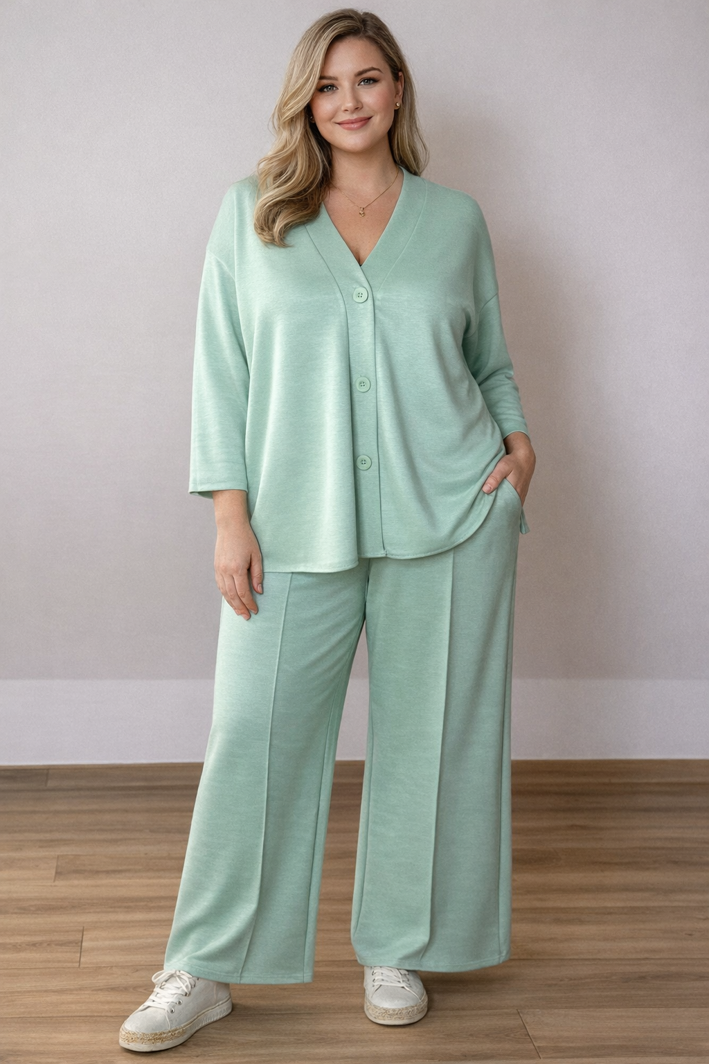 Verwen jezelf met deze comfortabele 2-delige set in grote maten, geschikt voor maat 44 tot en met kleine maat 50. Verkrijgbaar in de stijlvolle kleuren lichtgroen en zwart.