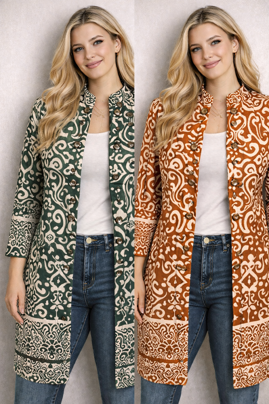 Stijlvolle blazer met een speels motief in olijfgroen, bruin en rood, afgewerkt met sierknopen.