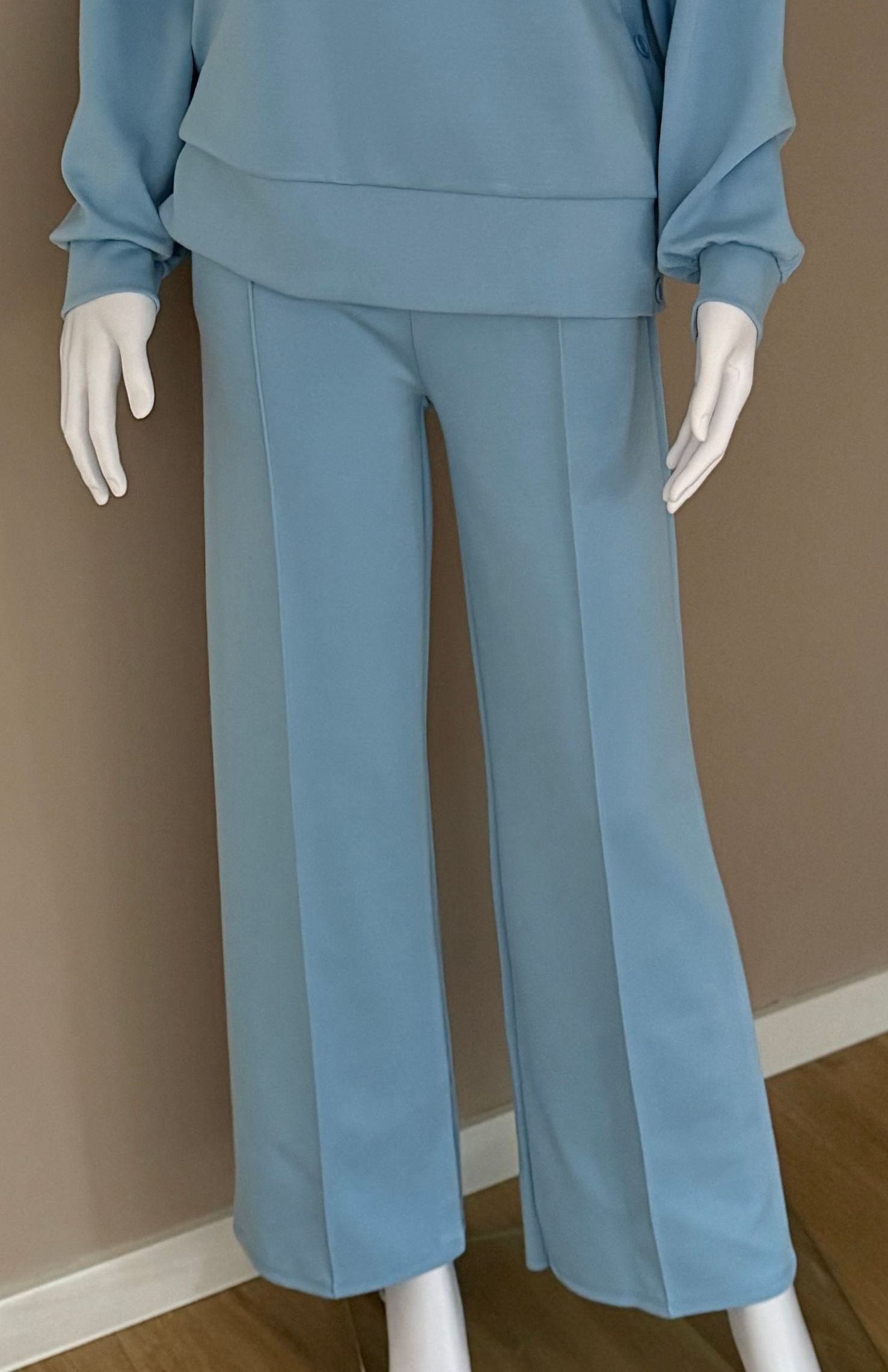Een prachtige comfy broek leuk om casual te dragen maar ook een even als netjes, door de gestikte naad in de broek, en om het af te maken ook steek zakken. Deze broek is verkrijgbaar in licht blauw of zwart en in de maten S, M, L en XL. (Bijpassende trui ook beschikbaar.)