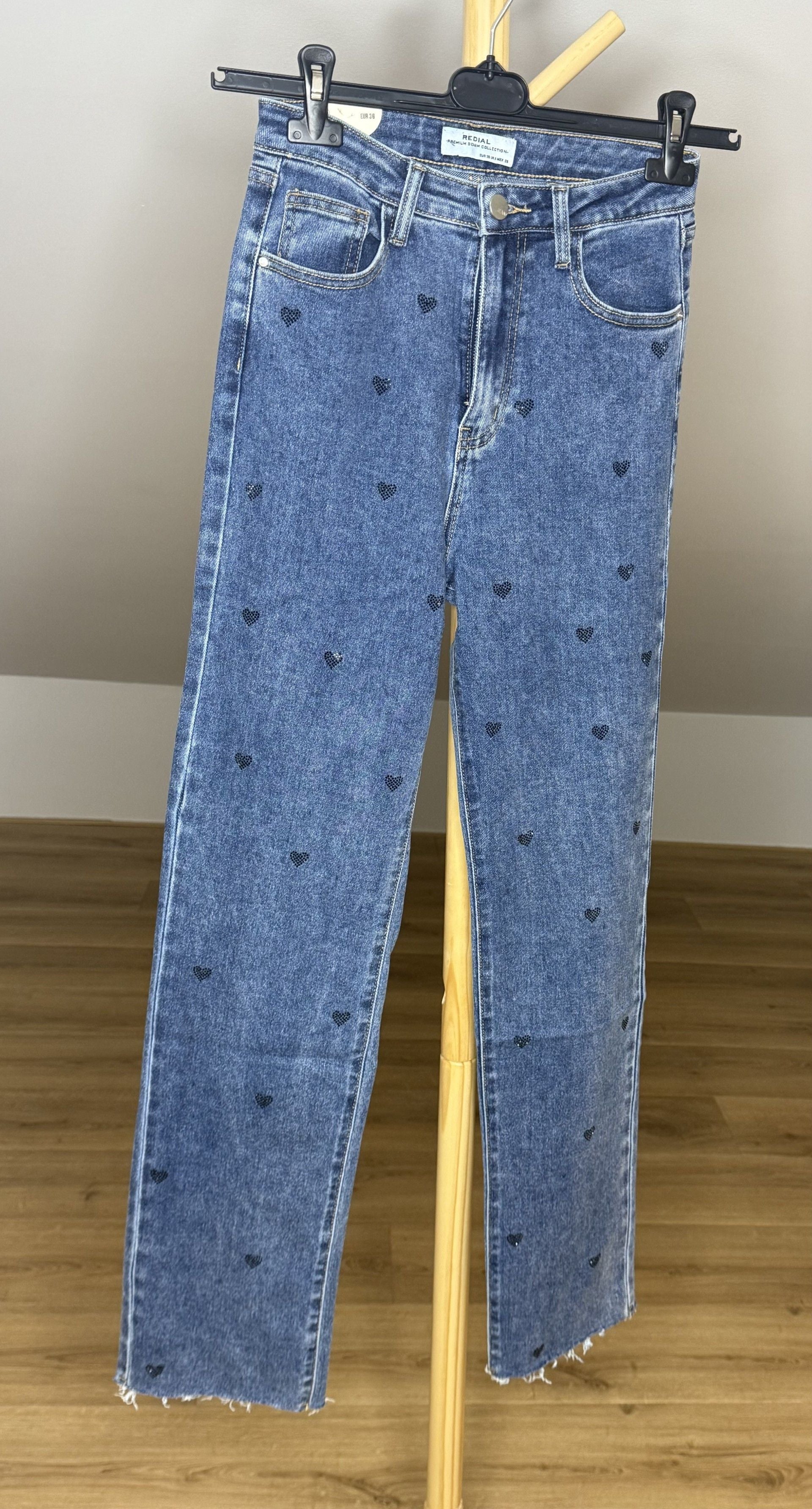 Straight jeans versierd met zwarte strass steentjes in de vorm van een hart.