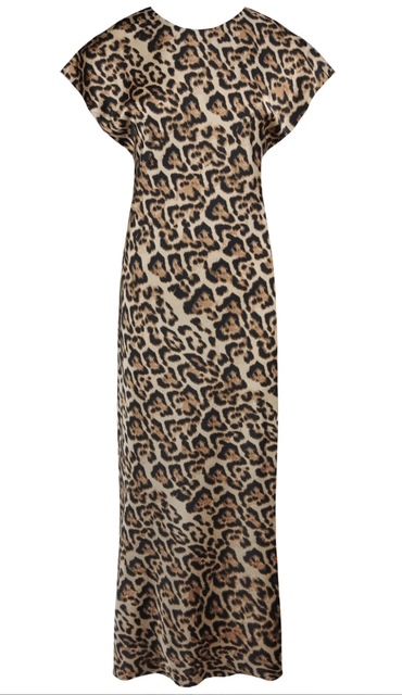 Lange elegante jurk met panterprint in een luxueuze satijnlook, verkrijgbaar in drie maten: S, M en L (S 36/38, M 38/40, L 40/42).