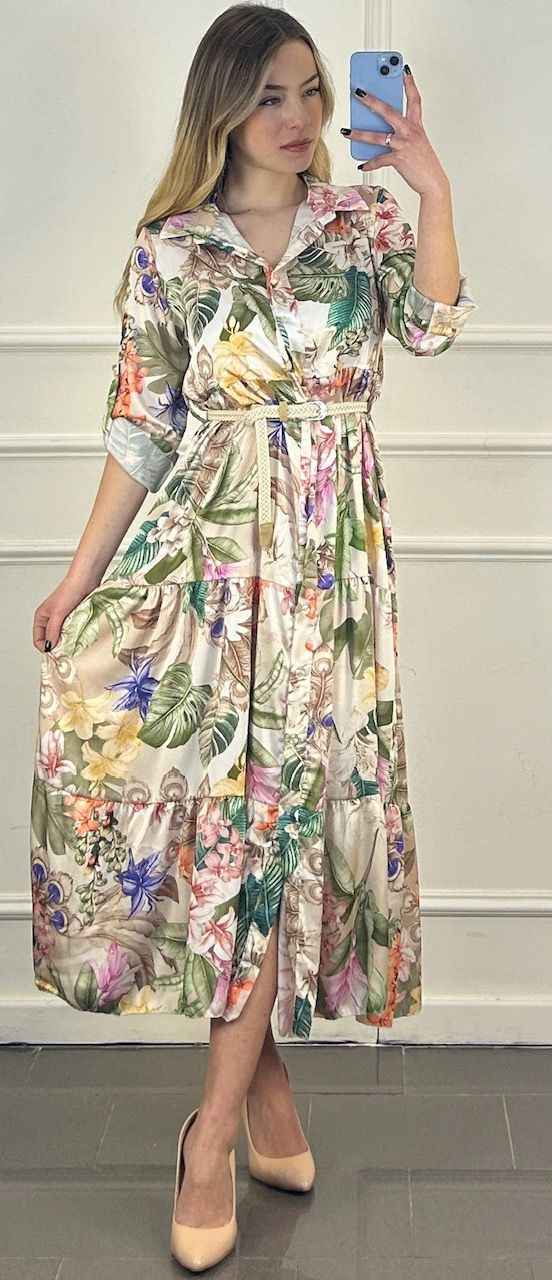 Prachtige lange jurk met bloemenprint, uitgevoerd in een luxe satijne uitstraling en voorzien van een elegante ceintuur.