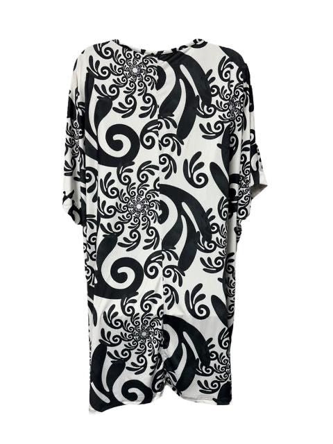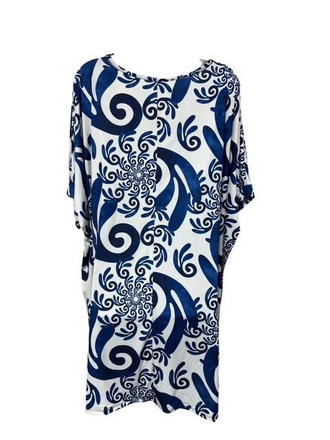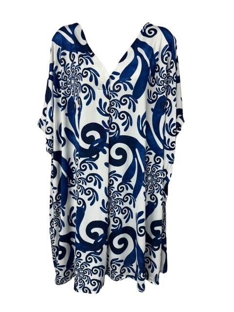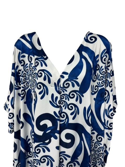 Prachtige Travel jurk voor de zomer met een verfijnde zwarte of blauwe print. One size, passend voor maat 44 tot en met maat 50.