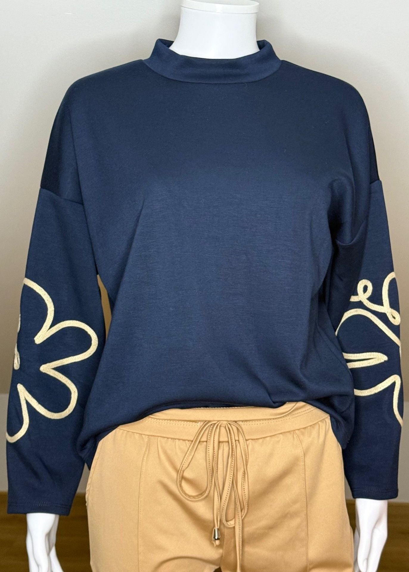 Diepblauwe trui met een mooi detail op de mouw. Verkrijgbaar in de maten S/M en L/XL.