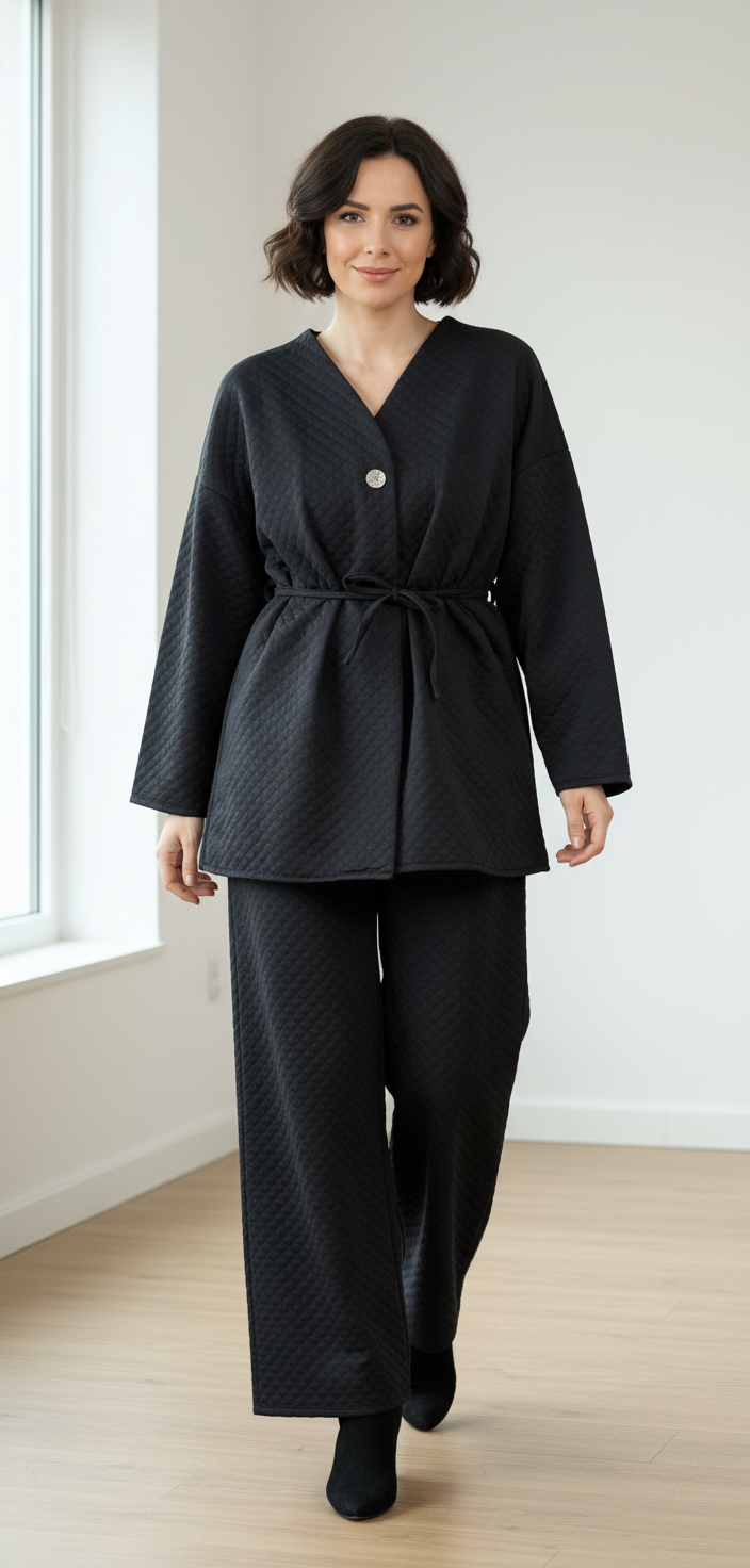 Comfortabel en stijlvol tweedelig pak met een doorgestikt vest en een wijde broek. Gemaakt van een zachte, soepele stof met lichte stretch voor een prettige pasvorm. Het pak is one size en geschikt voor maat 42 t/m 46.